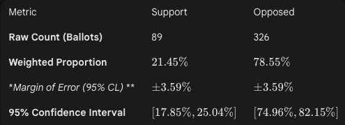 To ensure the ballot accurately represents the population, statistical analysis was calculated. The Finite Population Correction (FPC) factor was applied to the margin of error, which adjusts for the fact that a significant portion of the total population was surveyed. With these results is shows that if you ran the poll 100 times, you would get at least 95 of them showing 19-25% of households showing support for the trail and 75-82% in opposition of it’s construction.